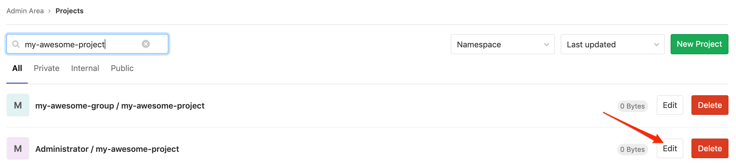 Navigate to the Admin Area > Overview > Projects dashboard on the primary node, find the project that you want to check the checksum differences and click on the Edit button: