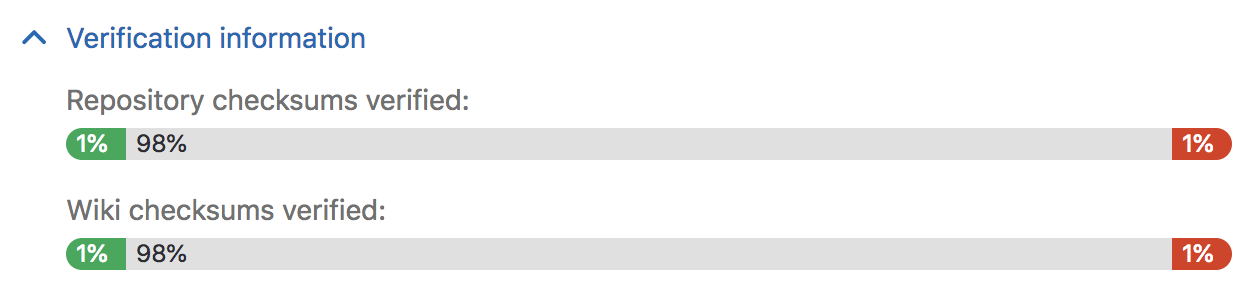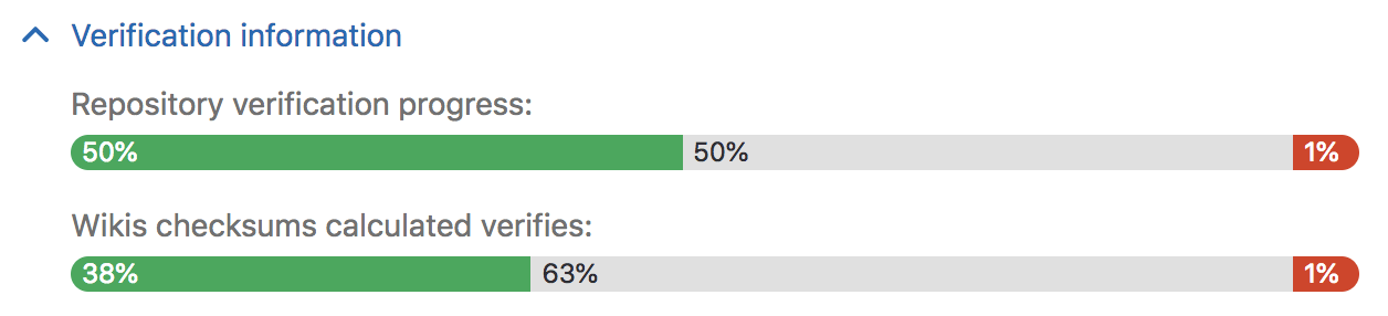 Navigate to the Admin Area > Geo dashboard on the primary node and expand the Verification information tab for that node to view automatic checksumming status for repositories and wikis. Successes are shown in green, pending work in gray, and failures in red.