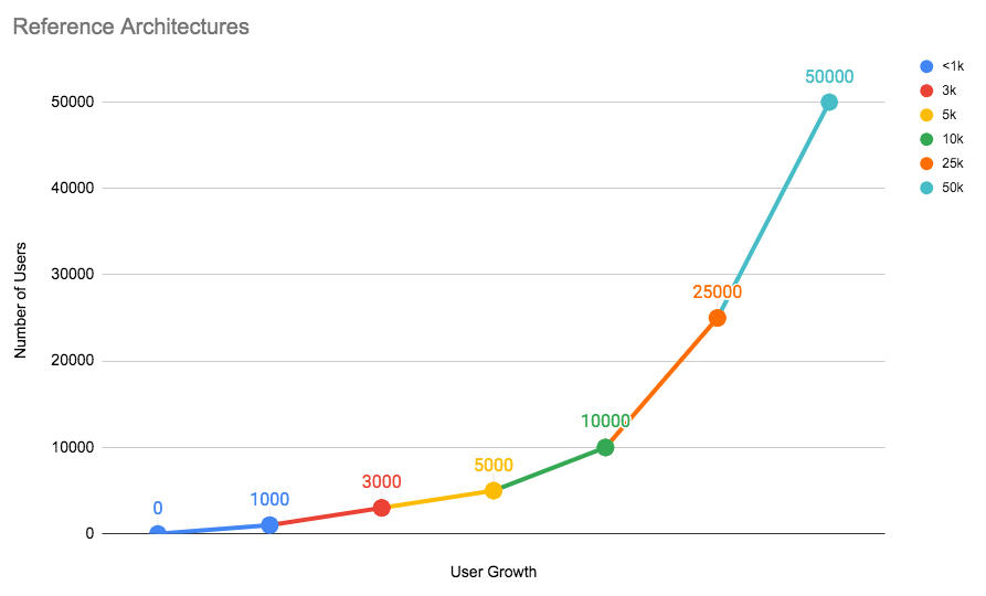 Below is a chart representing each architecture tier and the number of users they can handle. As your number of users grow with time, it’s recommended that you scale GitLab accordingly.