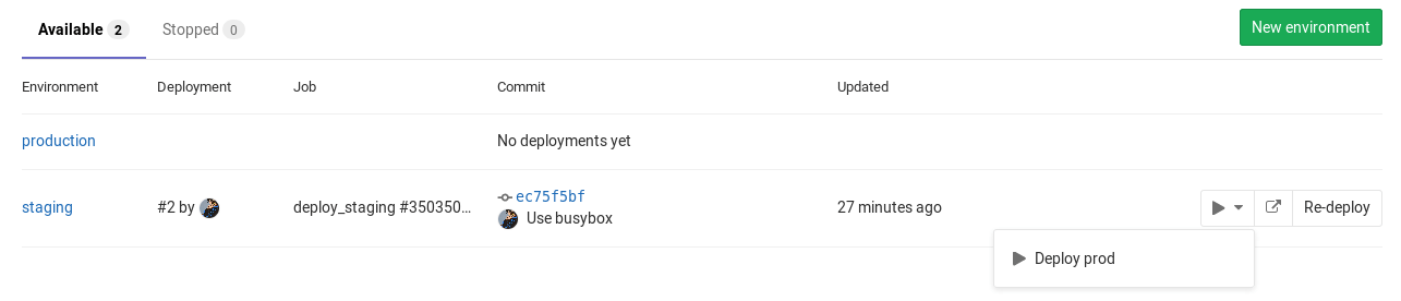 job deploys our code to a staging server while the deployment is recorded in an environment namedstaging
