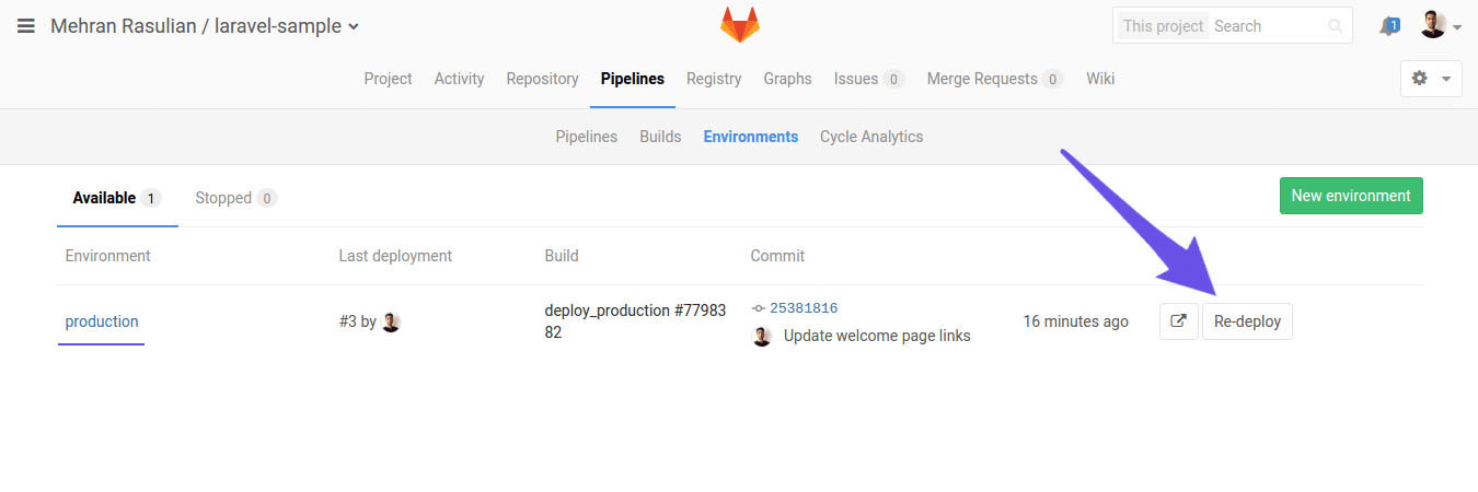 After our code passed through the pipeline successfully, we can deploy to our production server by clicking the play button on the right side.