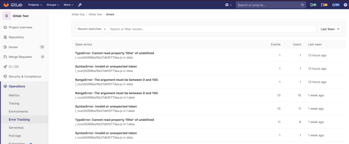 Users with at least Reporter permissions can find the Error Tracking list at Operations > Error Tracking in your project's sidebar. Here, you can filter errors by title or by status (one of Ignored , Resolved, or Unresolved) and sort in descending order by Frequency, First Seen, or Last Seen. By default, the error list is ordered by Last Seen and filtered to Unresolved errors.