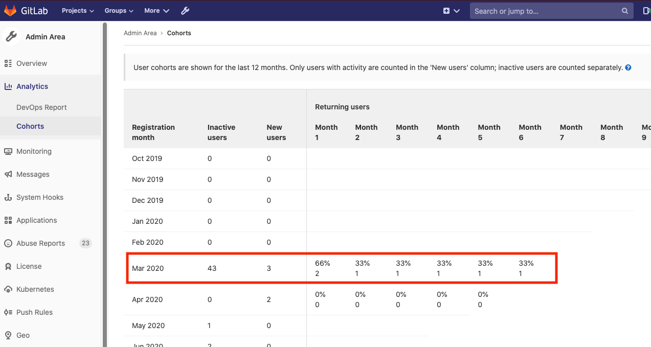 For the cohort of March 2020, three users were added to this server and have been active since this month. One month later (April 2020), two users are still active. Five months later (August 2020), one user from this cohort is still active, or 33% of the original cohort of three that joined in March.