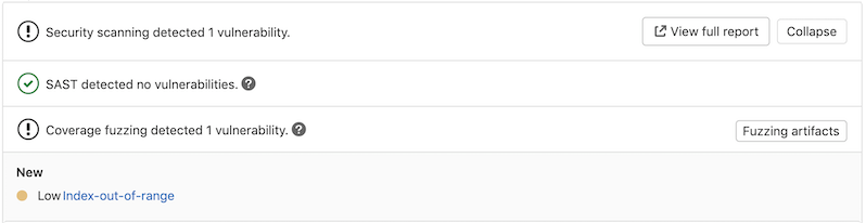 After a vulnerability is found, you can interact with it. The merge request widget lists the vulnerability and contains a button for downloading the fuzzing artifacts. By clicking one of the detected vulnerabilities, you can see its details.