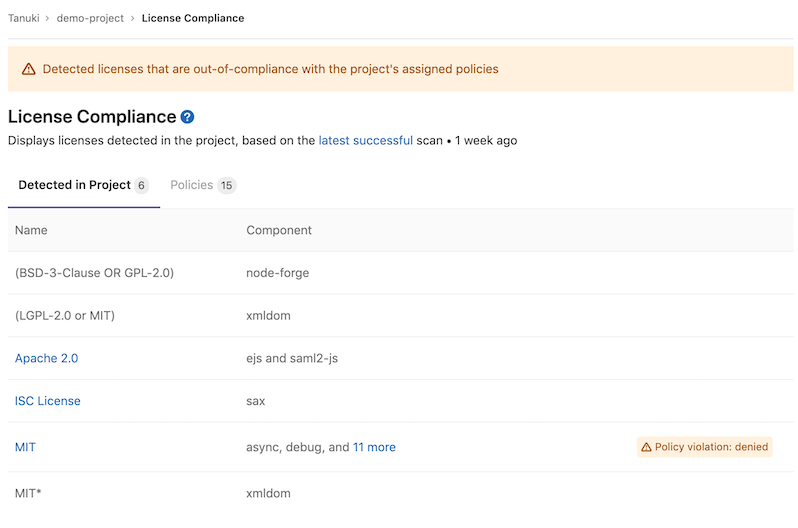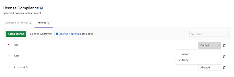 The Policies tab in the project's license compliance section displays your project's license policies. Project maintainers can specify policies in this section.
