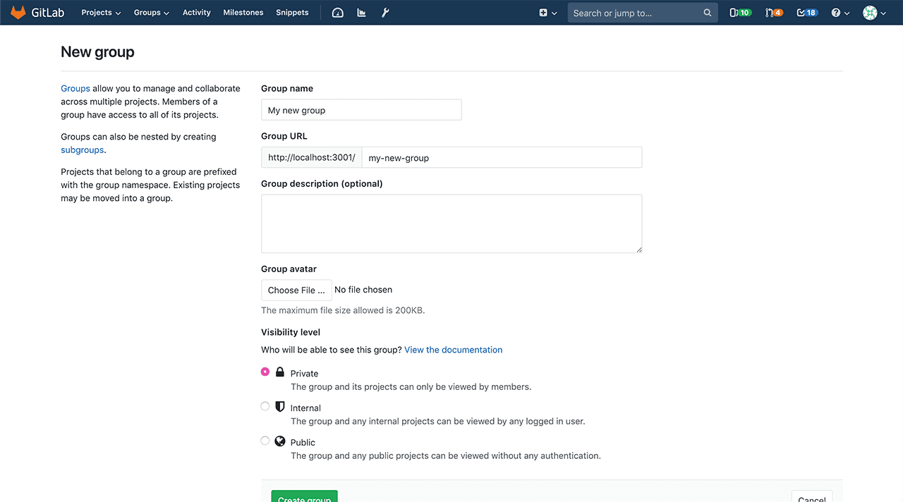 For more details on creating groups, watch the video GitLab Namespaces (users, groups and subgroups).