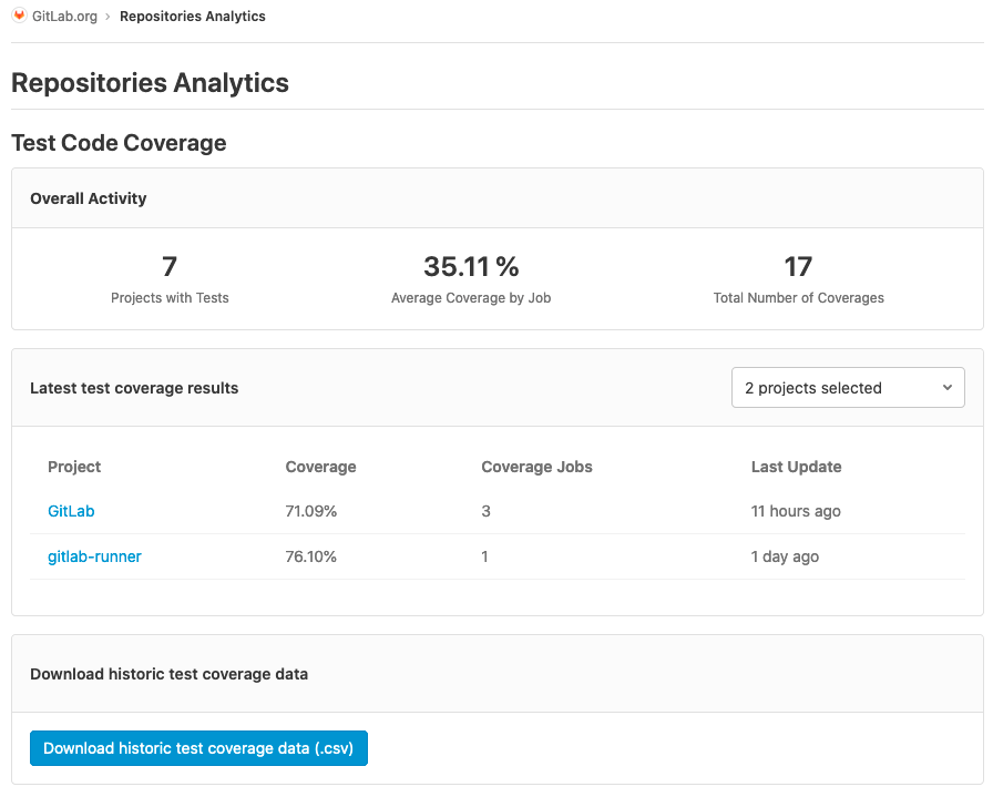 With GitLab Repositories Analytics, you can download a CSV of the latest coverage data for all the projects in your group.