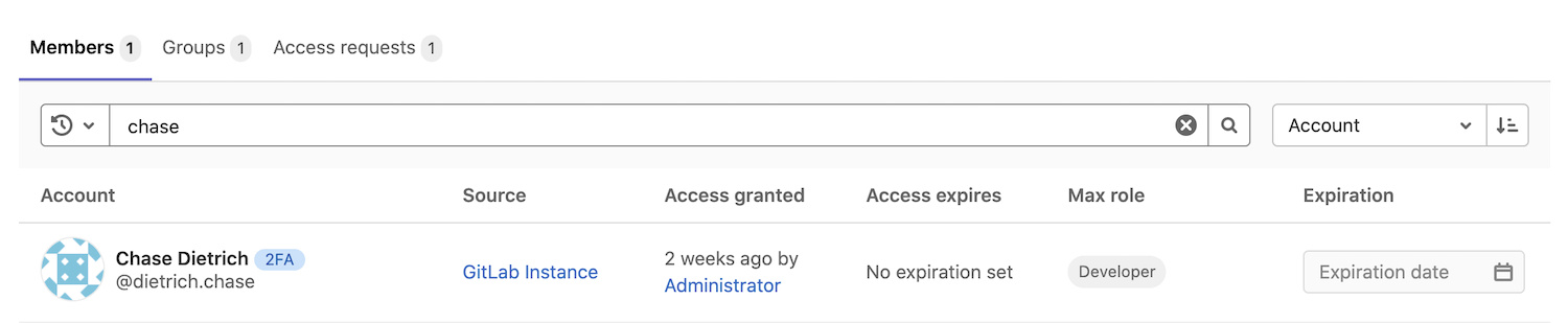 - Now, because this user is a Developer member of the group, they automatically get Developer access to all projects within that group.