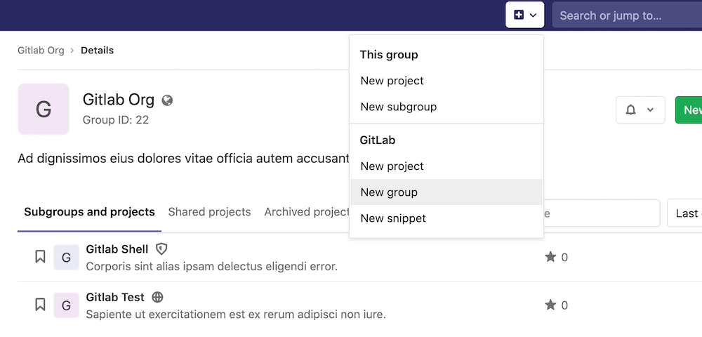 button in the top navigation bar, or the New subgroup button on an existing group's page. -
