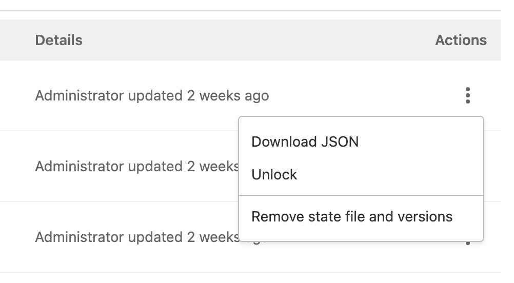 Actions: Actions you can take on the state file, including downloading, locking, unlocking, or removing the state file and versions: