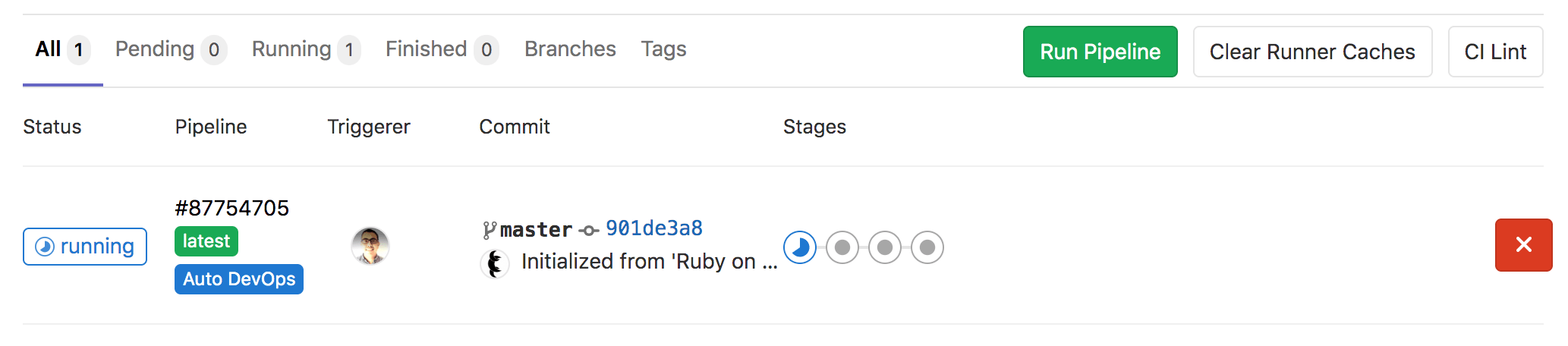 To navigate inside the pipeline, click its status badge (its status should be "Running"). The pipeline is split into a few stages, each running a couple of jobs.