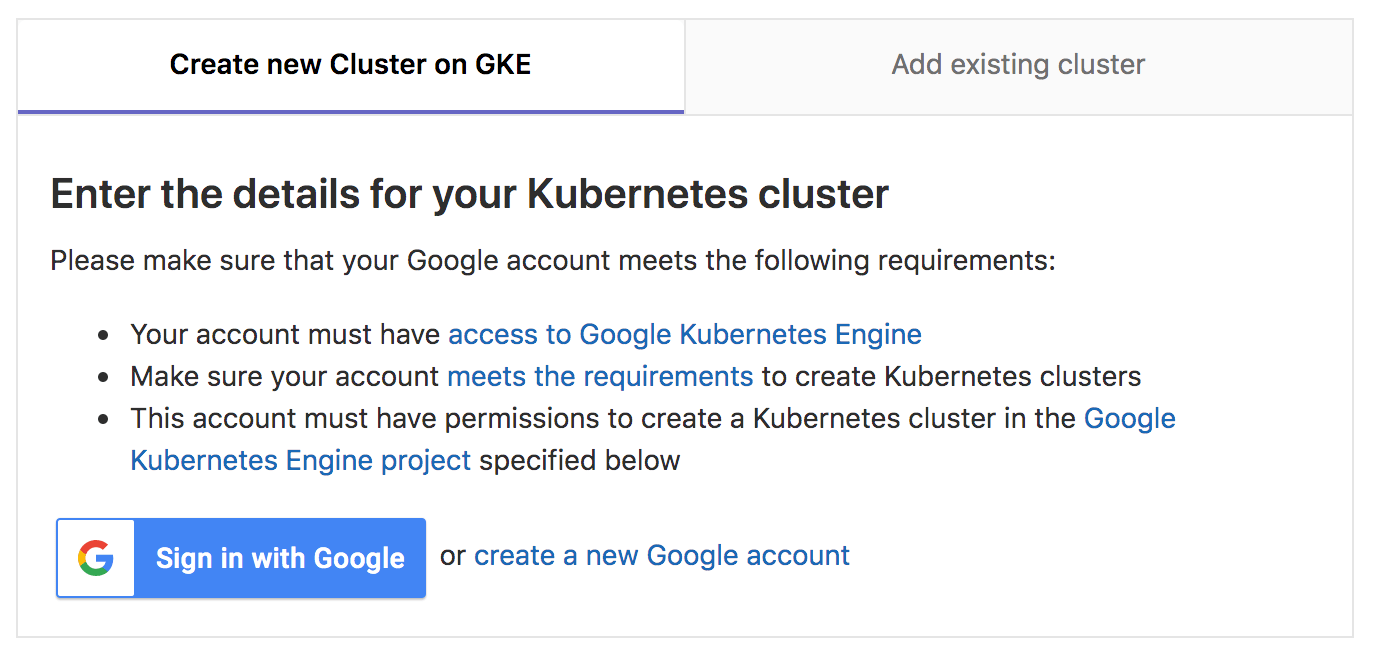 On the Create new cluster on GKE tab, click Sign in with Google.