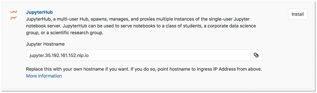 After Ingress has been installed successfully, click the Install button next to the JupyterHub application. You need the Jupyter Hostname provided here in the next step.
