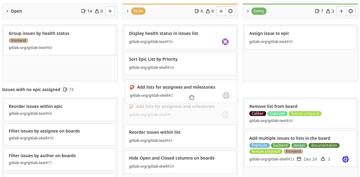 With multiple issue boards, each team has one board. Now you can move issues through each part of the process. For instance: To Do, Doing, and Done.
