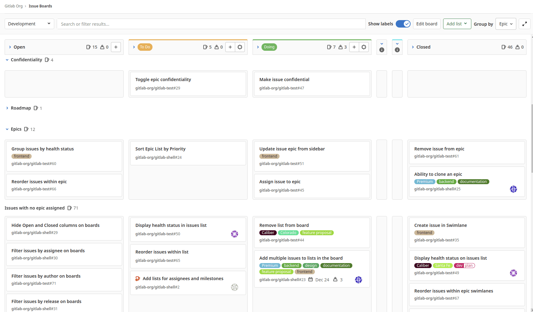 For examples of using issue boards along with epics (PREMIUM), issue health status (ULTIMATE), and scoped labels (PREMIUM) for various Agile frameworks, check: