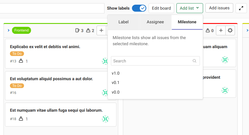 For example, you can create a list based on the label of Frontend and one for Backend. A designer can start working on an issue by adding it to the Frontend list. That way, everyone knows that this issue is now being worked on by the designers.