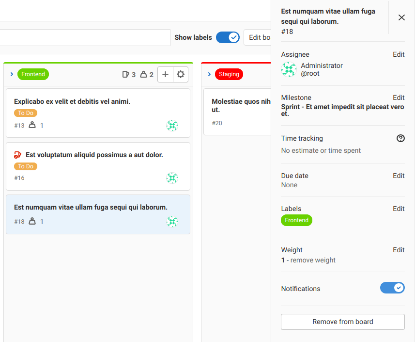 - Clicking a label inside a card quickly filters the entire issue board and show only the issues from all lists that have that label.
