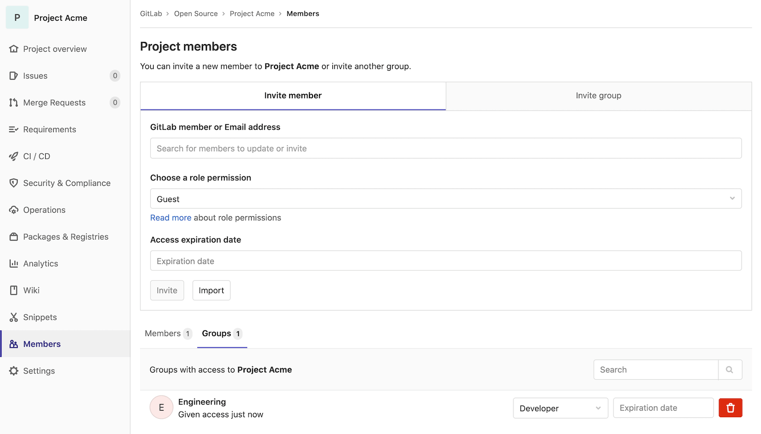 The primary mechanism to give a group of users, say 'Engineering', access to a project, say 'Project Acme', in GitLab is to make the 'Engineering' group the owner of 'Project Acme'. But what if 'Project Acme' already belongs to another group, say 'Open Source'? This is where the group sharing feature can be of use.