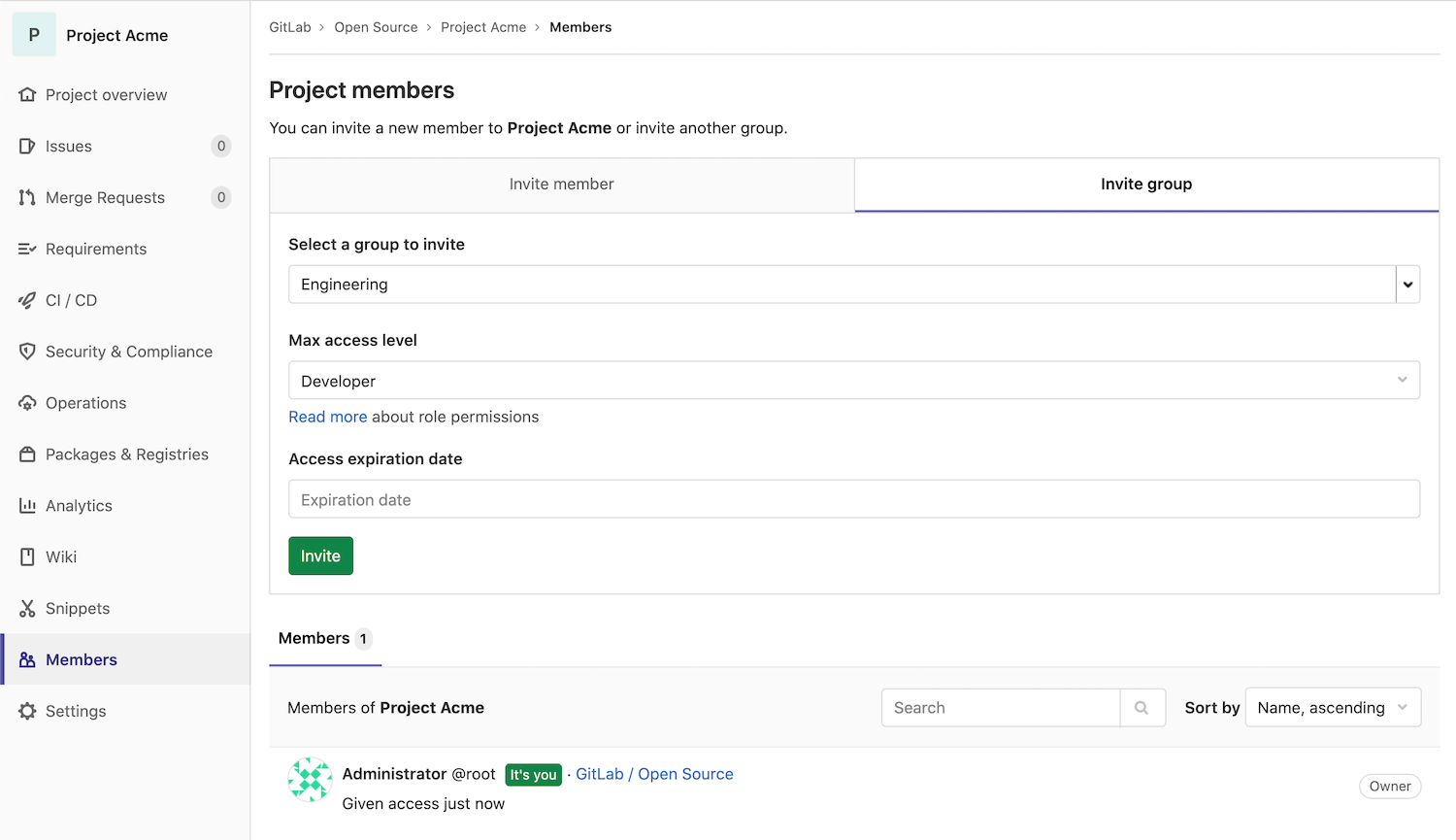 In the example above, the maximum access level of 'Developer' for members from 'Engineering' means that users with higher access levels in 'Engineering' ('Maintainer' or 'Owner') only have 'Developer' access to 'Project Acme'.