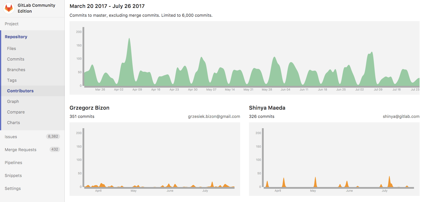 They are ordered from the collaborator with the greatest number of commits to the fewest, and displayed on a nice graph: