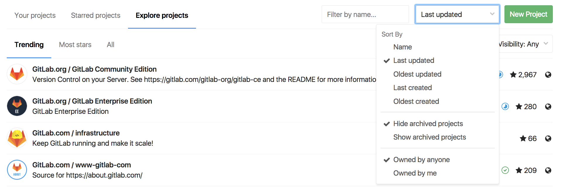 You can also look for the projects you starred (Starred projects), and Explore all public and internal projects available in GitLab.com, from which you can filter by visibility, through Trending, best rated with Most stars, or All of them.